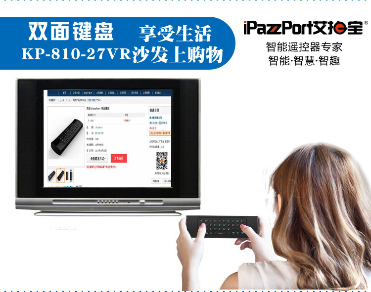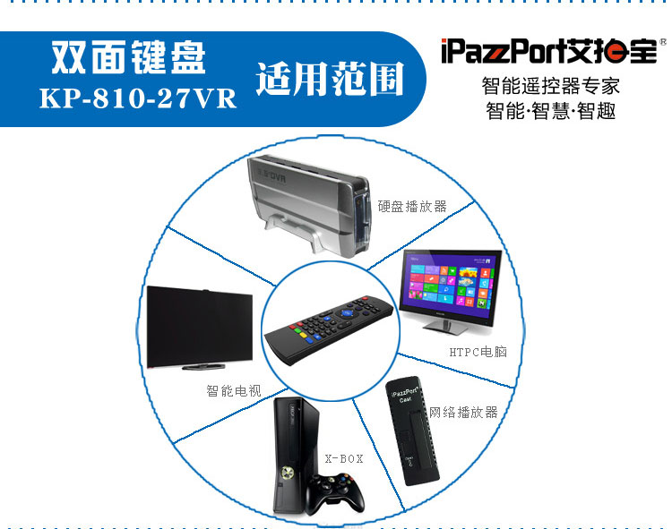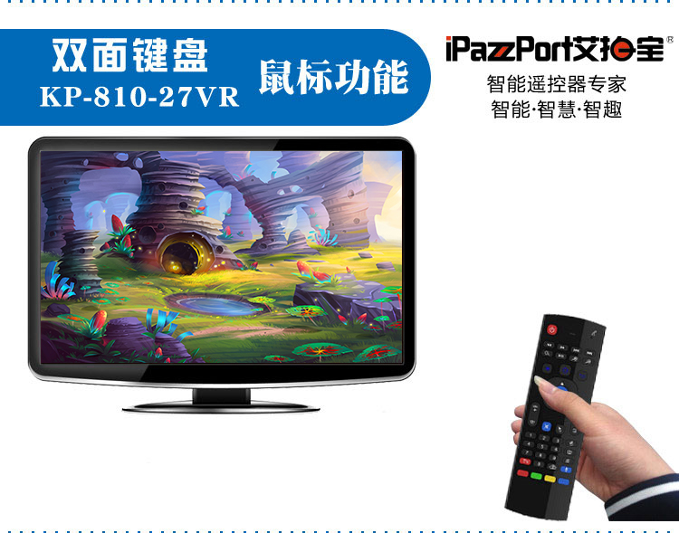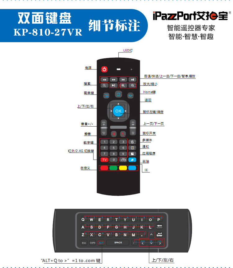 无线语音键盘+红外学习型遥控器 KP-810-27VR最大特点为:语音输入, 还可以通过红外功能远程控制其他家电设备。双面设计理念超乎想象力。适用于车载电视,HTPC,大屏电视,智能电视,硬盘播放器,网络播放器,X-BOX的外接键盘。