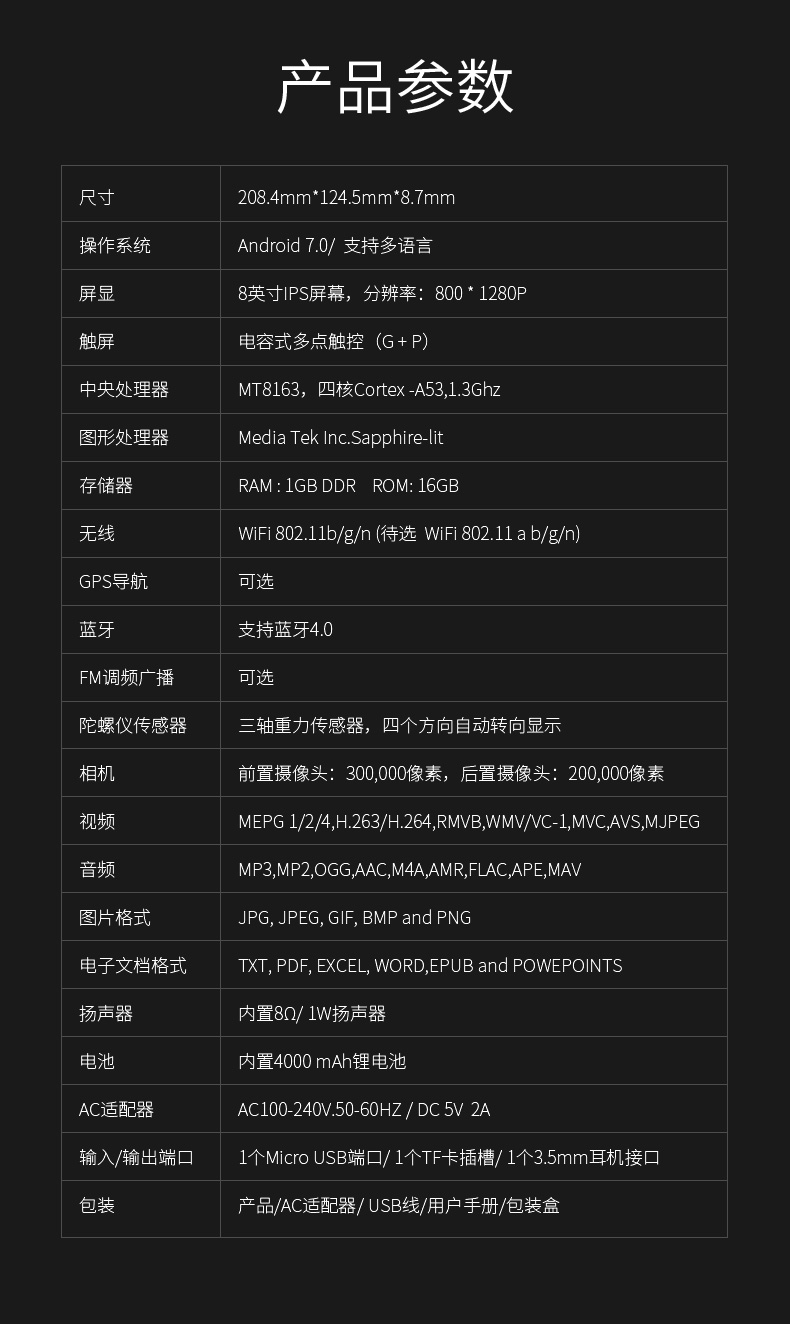 多点触控平板电脑运行Android 7 0系统,支持多点触控。支持蓝牙传输,CPU 为MT8163 ,Quad core Cortex -A53, 1 3Gh。外形轻巧,使用携带。